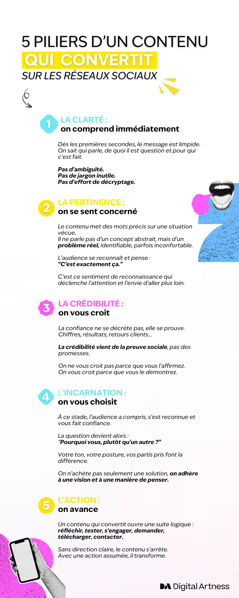 Il suffit de passer d’une publication “au feeling” à une publication pensée stratégiquement, construite autour des 5 piliers : clarté, pertinence, crédibilité, incarnation et action.
